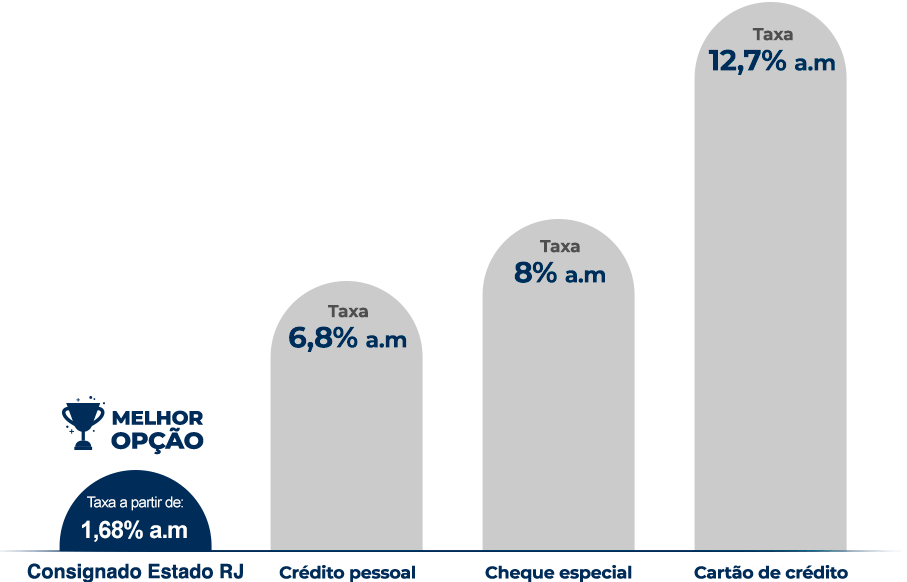 • Por ser descontado diretamente no contracheque do servidor, o consignado Estado RJ possui taxa de juros mais baixas do que outras modalidades de crédito, com taxa de juros a partir de 1,68% ao mês.